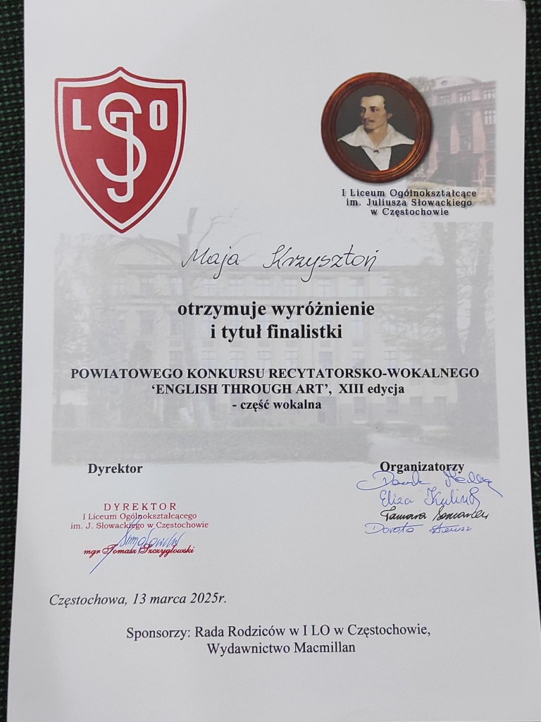Miło nam poinformować, że w dniu 13 marca Maja Krzysztoń wyśpiewała tytuł finalistki z wyróżnieniem w XIII edycji Powiatowego Konkursu Recytatorsko – Wokalnego pt.: “ENGLISH THOUGH ART” .