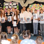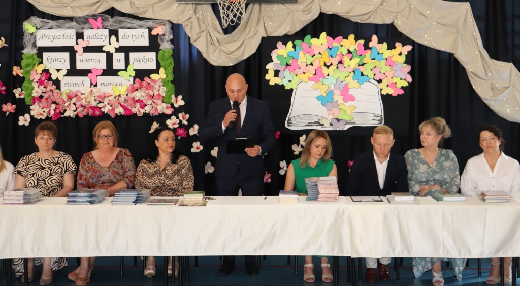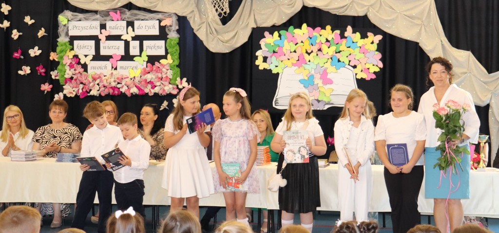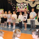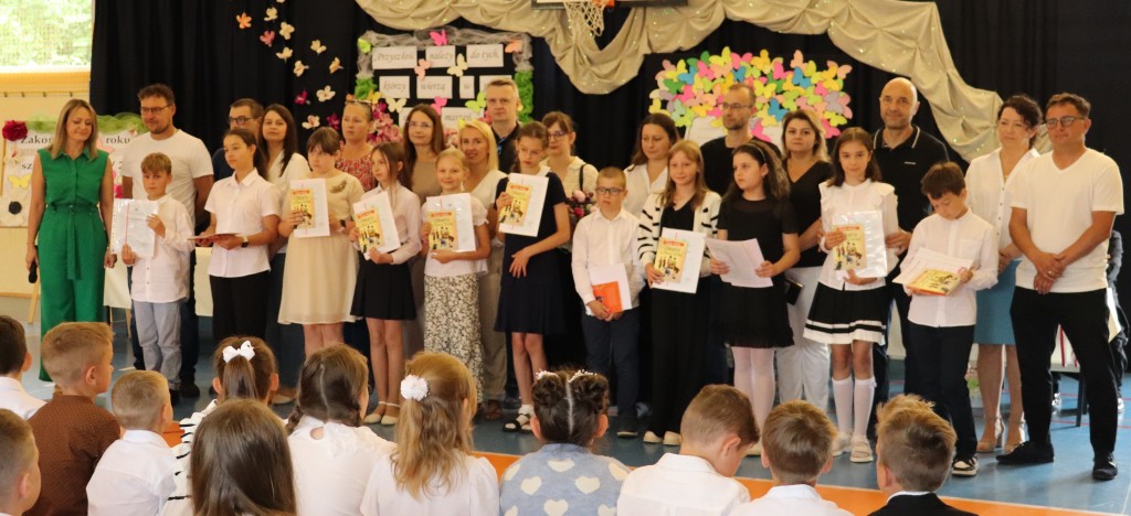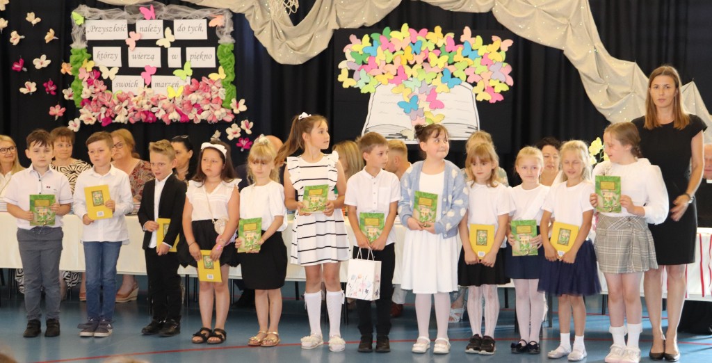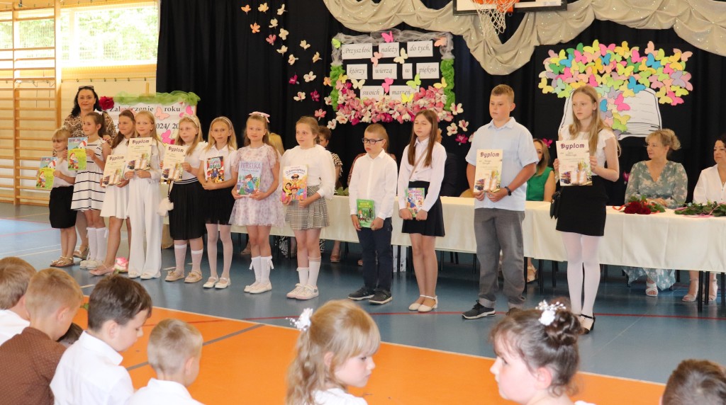 Społeczność szkolna zgromadziła się o godzinie 10.00 na sali gimnastycznej. W tym wyjątkowym dniu dzieciom towarzyszyli rodzice, którzy z radością i dumą zerkali na swoje pociechy. Po odśpiewaniu hymnu narodowego, licznie zebranych powitał dyrektor szkoły, pan Wojciech Kucia. W swoim przemówieniu podziękował wszystkim za miniony rok szkolny, pogratulował osiągnięć i sukcesów, oraz życzył udanych i bezpiecznych wakacji. Następnie wychowawcy klas 1-7 zapraszali na środek sali uczniów, którzy uzyskali świadectwo z wyróżnieniem. Wręczone zostały nagrody książkowe za wspaniałe i bardzo dobre wyniki w nauce oraz się zachowanie godne pochwały. Kolejnym puntem uroczystości było wręczenie świadectw ukończenia szkoły podstawowej najstarszy uczniom naszej szkoły-ósmoklasistom. Po rozdaniu świadectw nadszedł moment wyrażenia uznania dla osób szczególnie zaangażowanym, wychowanków, którzy godnie reprezentowali naszą szkołę uczestnicząc w licznych konkursach. Wyróżniono również uczniów aktywnie działających na rzecz szkoły oraz odnoszących sukcesy sportowe.