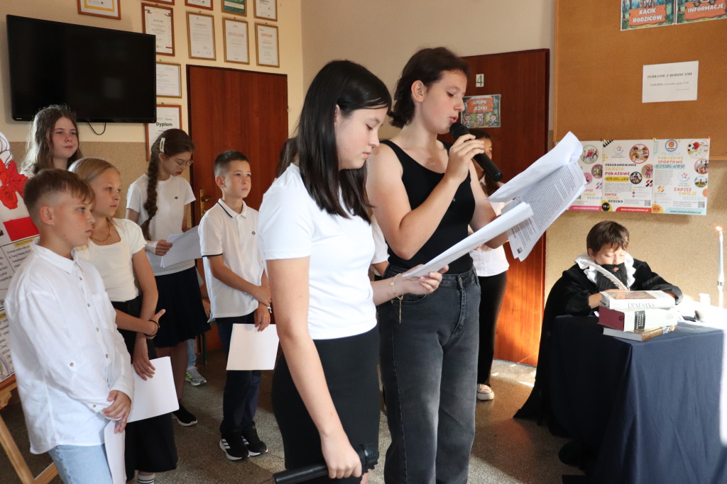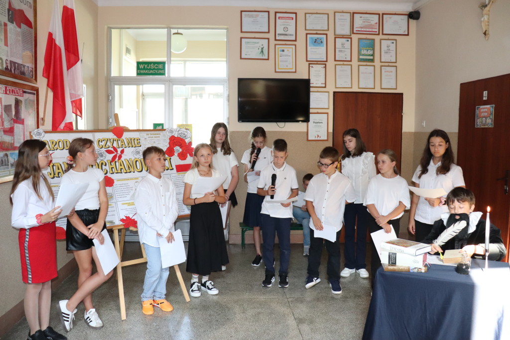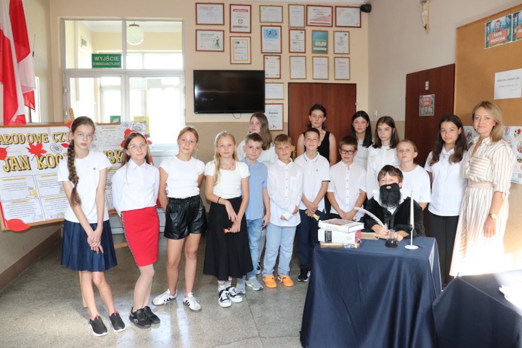 W piątek tj. 5 września 2025 r. klasa V oraz uczennice kl. VIII ( Weronika Zielska i Agata Nowak) podjęli się zadania, aby całej społeczności szkolnej przybliżyć postać wybitnego twórcy renesansowego – mistrza Jana Kochanowskiego. Były więc fakty z życia, dorobek literacki, ciekawostki o autorze oraz recytacja najpiękniejszych utworów ojca literatury polskiej. Tym licznym wiadomościom przysłuchiwał się sam poeta – w tej roli zadebiutował Franciszek Górecki!